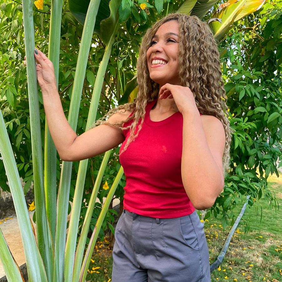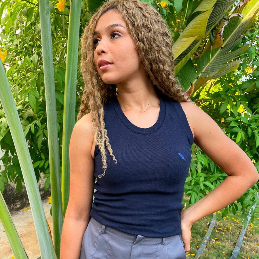Regata em malha canelada, com um detalhe minimalista no peito esquerdo que simboliza a marca. Combina com um visual descontraído e arrumado.